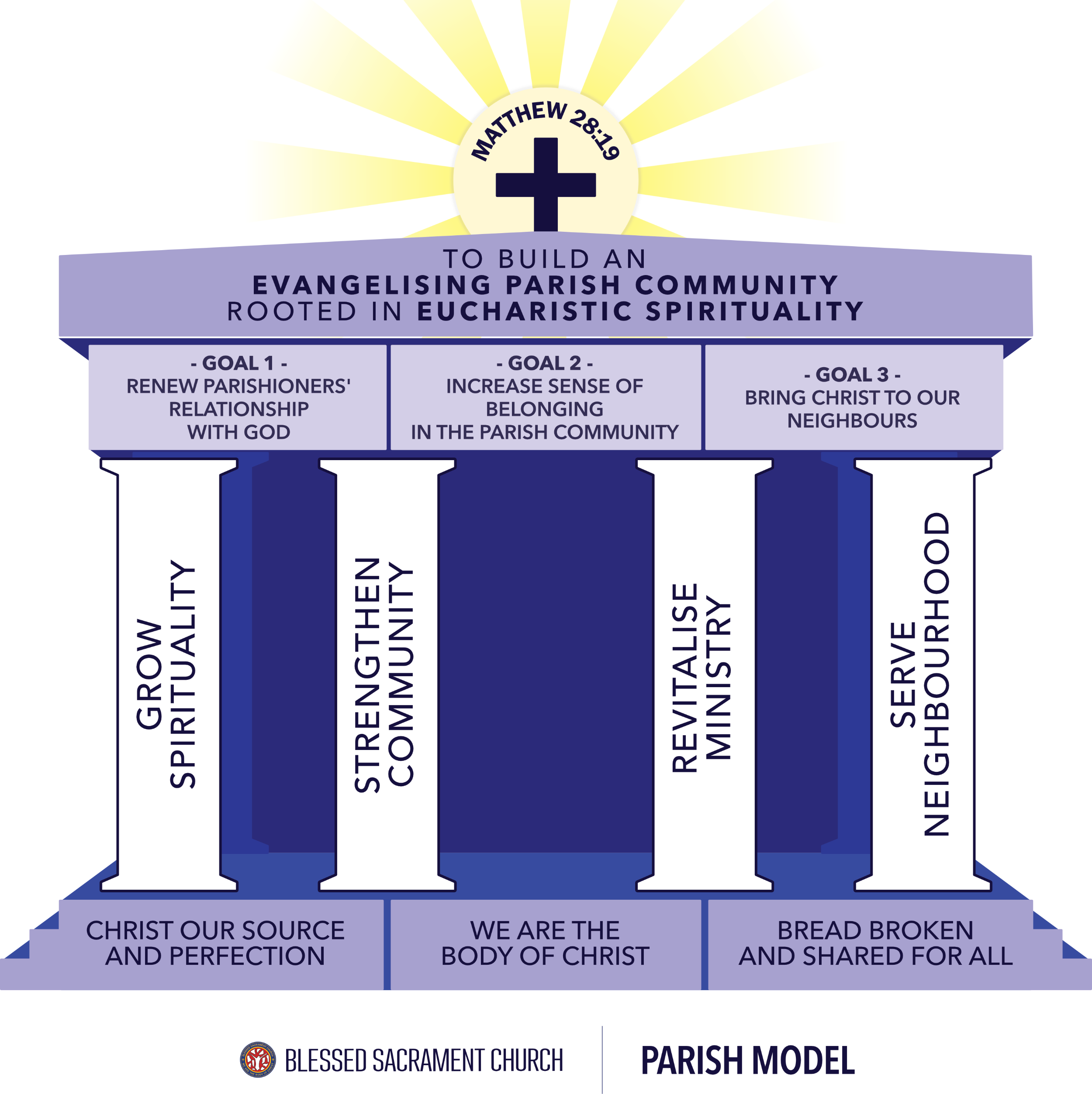 This Eucharistic Spirituality is to be nourished by the Eucharist and by contemplating the Eucharist, we will become the Body of Christ so that everyone can see the presence of Christ in each of us. Blessed Sacrament Church’s vision is achieved through 3 goals and supported by 4 pillars.